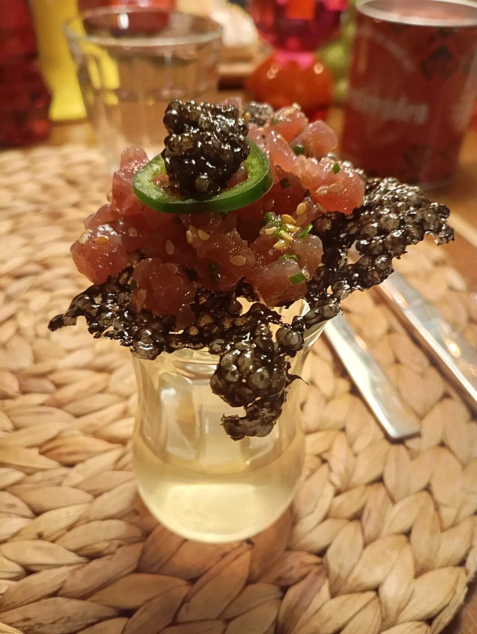 - Zunächst die Dashibrühe erhitzen und in ein Glas füllen. Dann Chip auf Glas, Tartar auf Chip, Jalopeno auf Tartar und Kaviar auf Jalopeno.